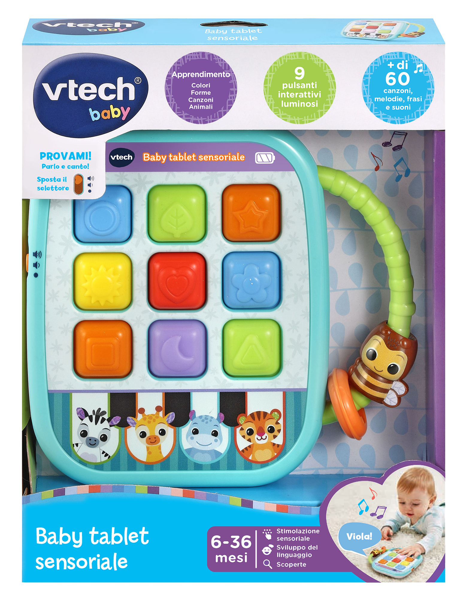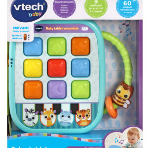 Il tablet può essere portato facilmente ovunque grazie al manico adatto alle manine del tuo piccolo. Una piccola ape e un anello colorati inoltre, stimolano la sua motricità fine.