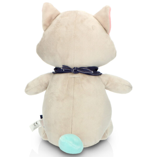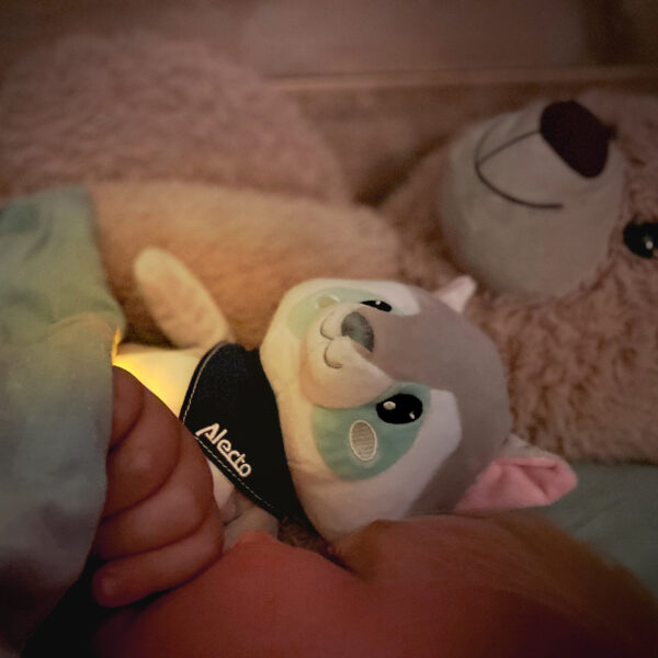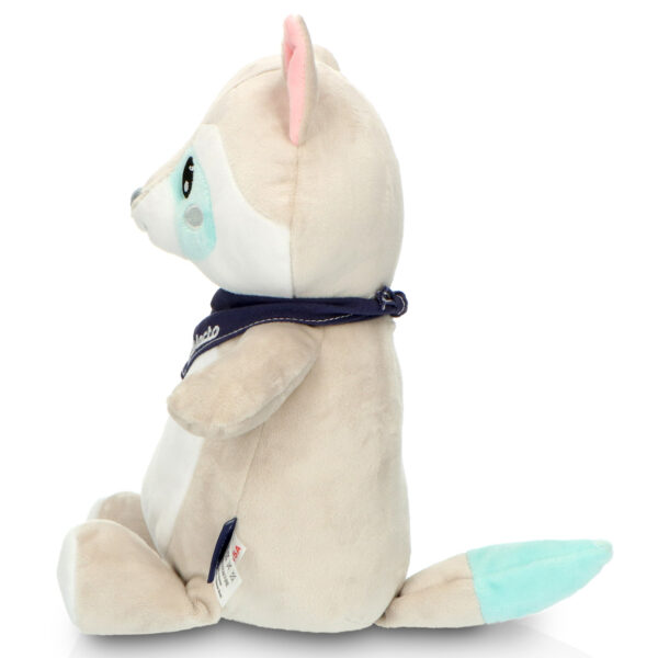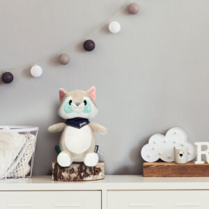 Il peluche ha la forma di un simpatico procione che il bambino può tenere vicino a sé quando è ora di fare la nanna. C’è una luce notturna all’interno del pancino che si accende premendo la zampetta. La luce si spegne automaticamente dopo 30 minuti. L’intensità della luce è regolabile (3 livelli + spento) premendo sempre sullo stesso pulsante.