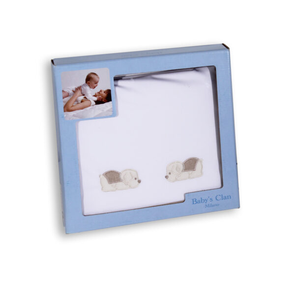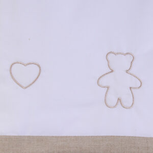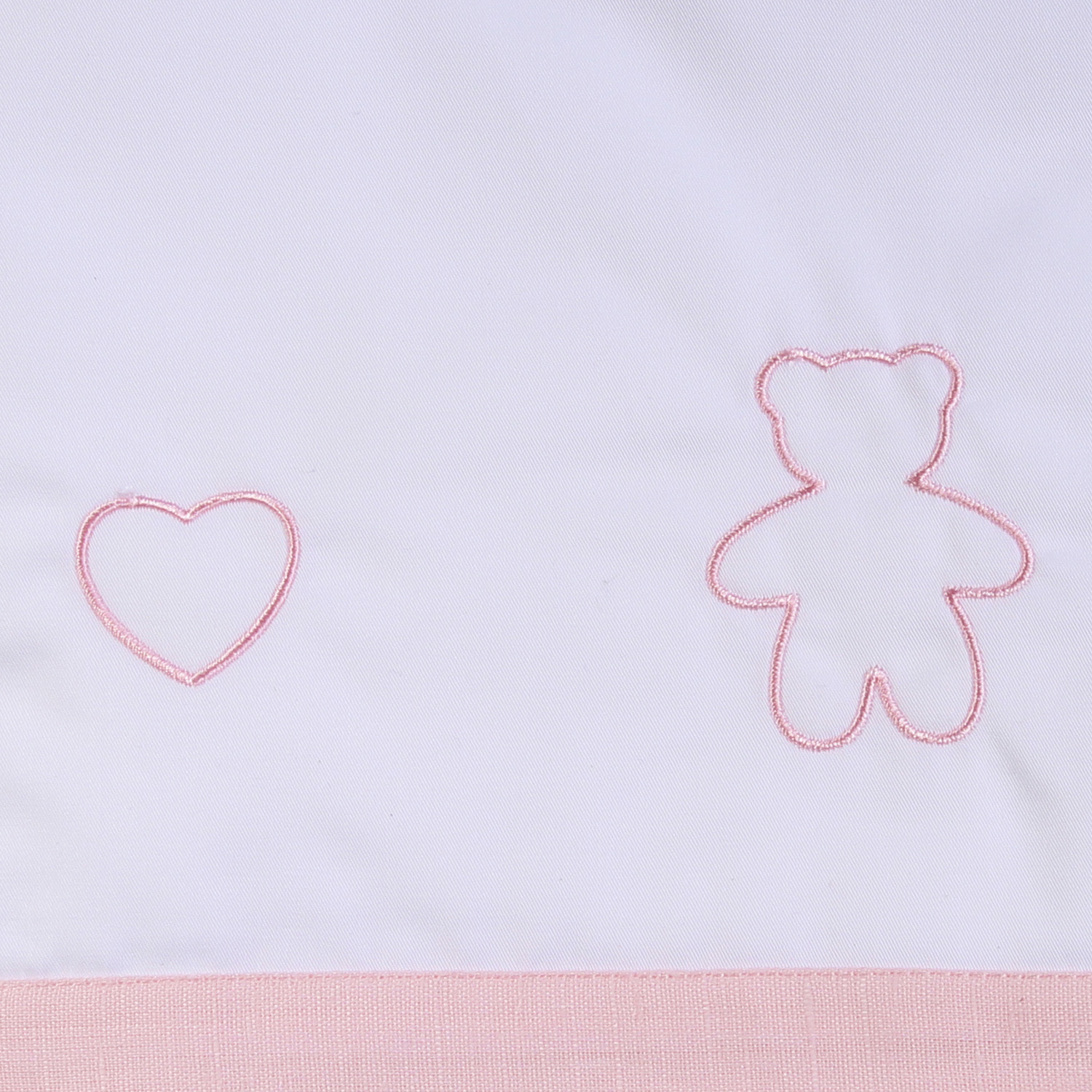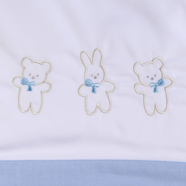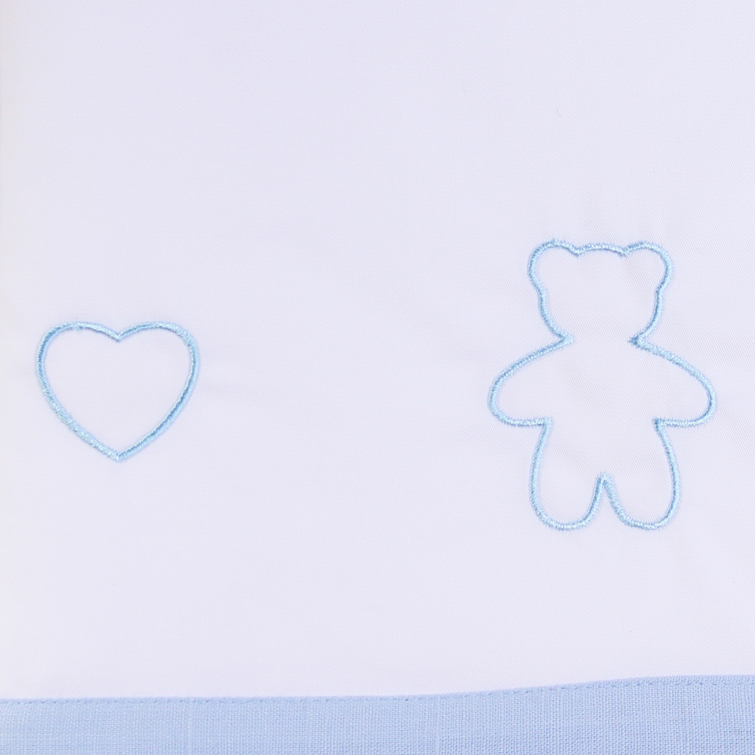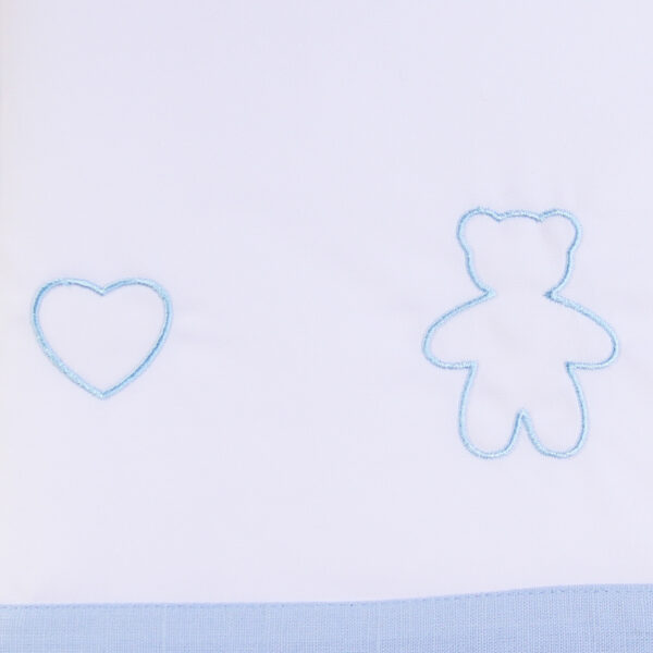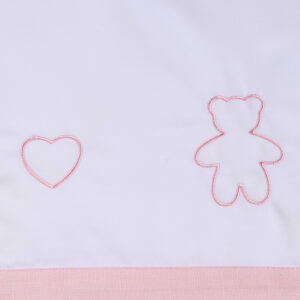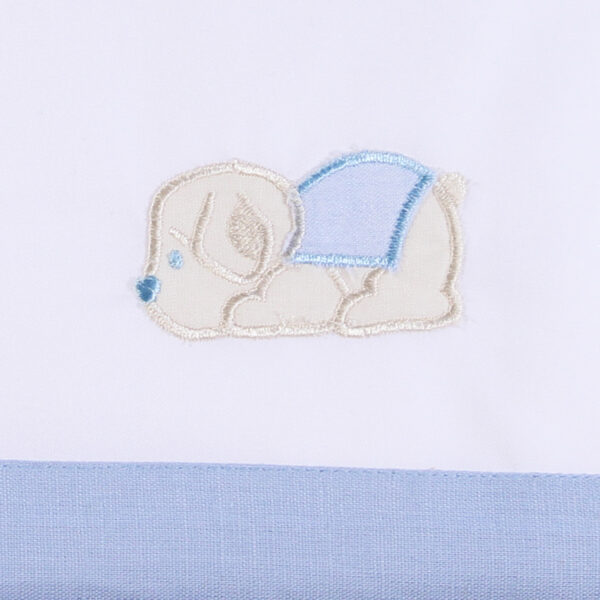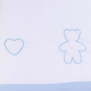 Set lenzuola per lettino composto da 3 pezzi: lenzuolo sotto con angoli elastici, lenzuolo sopra e federa cuscino. Realizzato in cotone egiziano di primissima qualità e 100% Made in Italy. Il set è utilizzabile su materassi 120×60 cm, 124×63 cm e 125×60 cm. Balza impreziosita da bordo colorato e tenero ricamo.